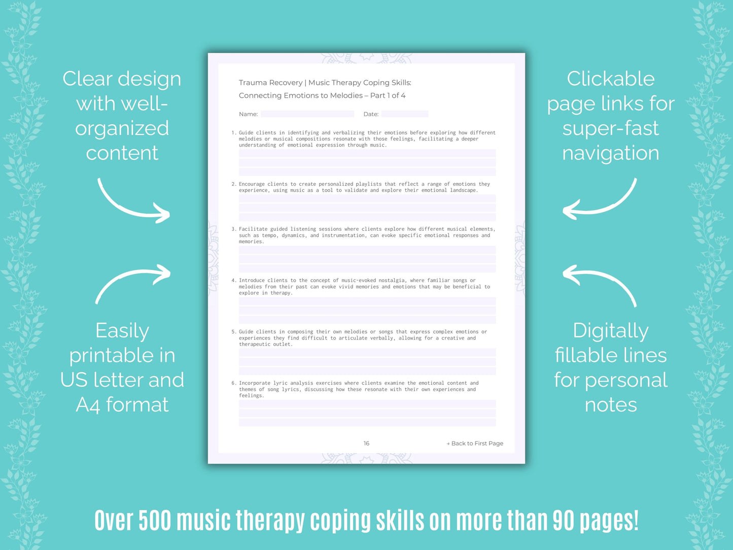 📚 Contains: One PDF workbook with over 500 music therapy coping skills for trauma recovery therapy in 22 sections, instantly downloadable in US letter and A4 size.