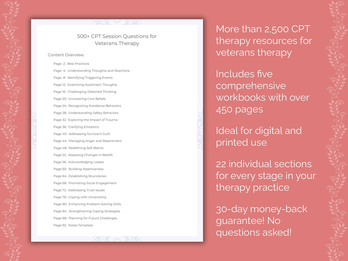 📚 Contains: Five PDF workbooks with over 2,500 therapy resources (session questions, interventions, progress notes, session activities, and coping skills), each in 22 sections, instantly downloadable in US letter and A4 size.
