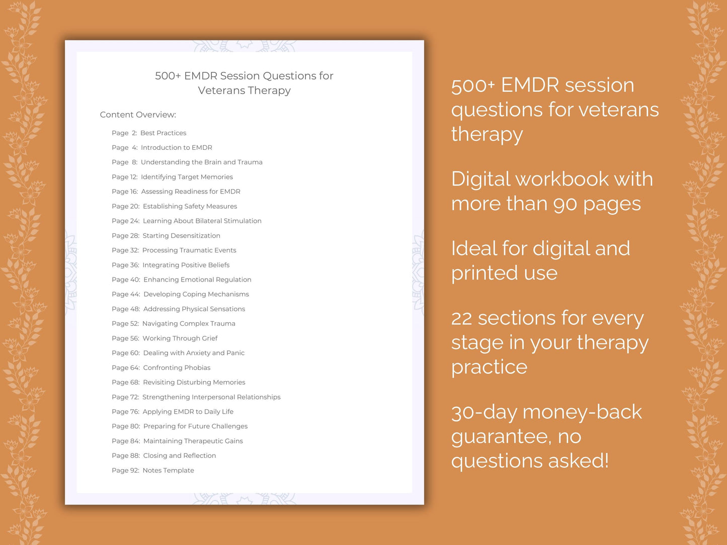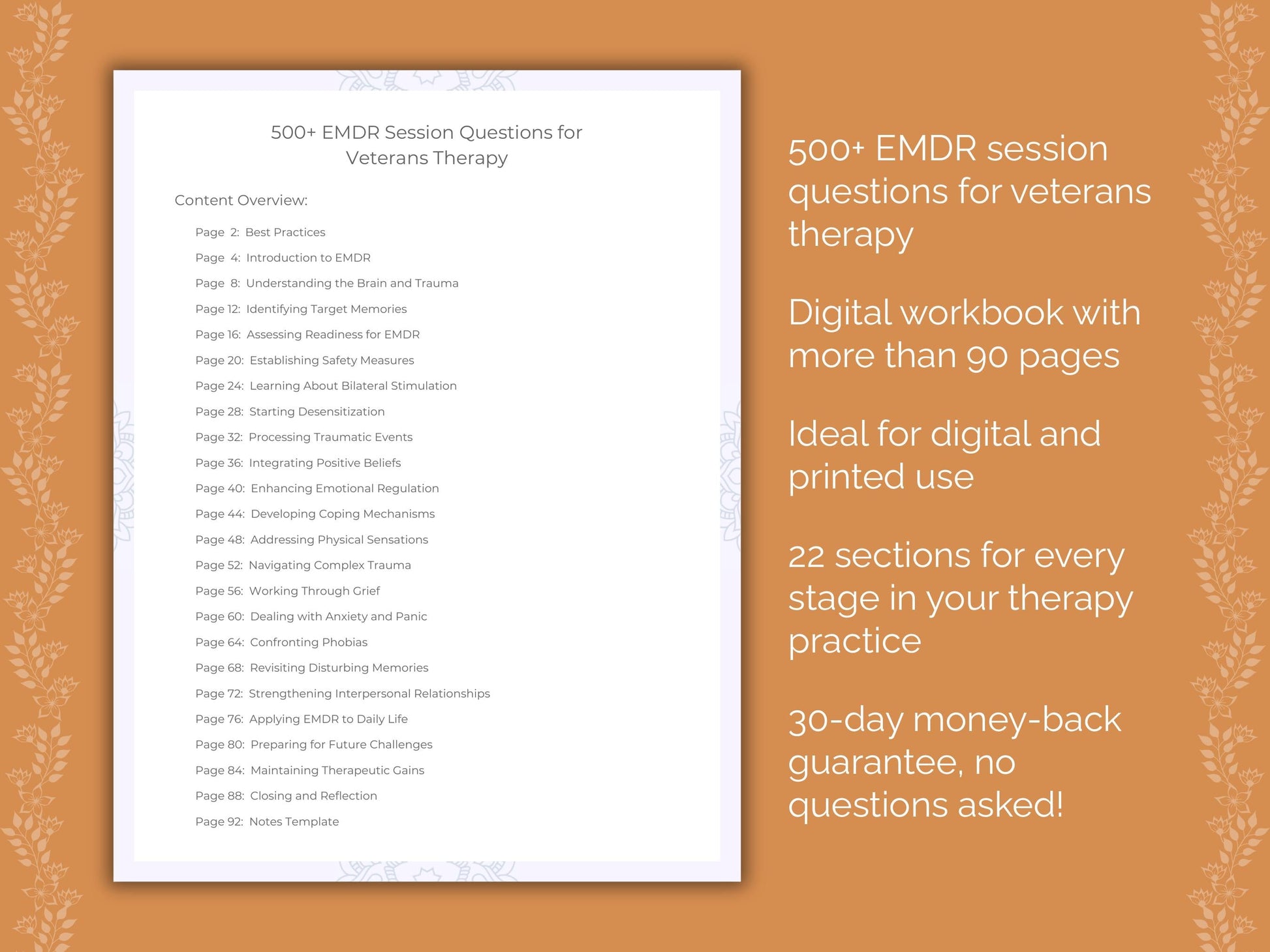 📚 Contains: One PDF workbook with over 500 eye movement desensitization and reprocessing (EMDR) therapy session questions for veterans therapy in 22 sections, instantly downloadable in US letter and A4 size.