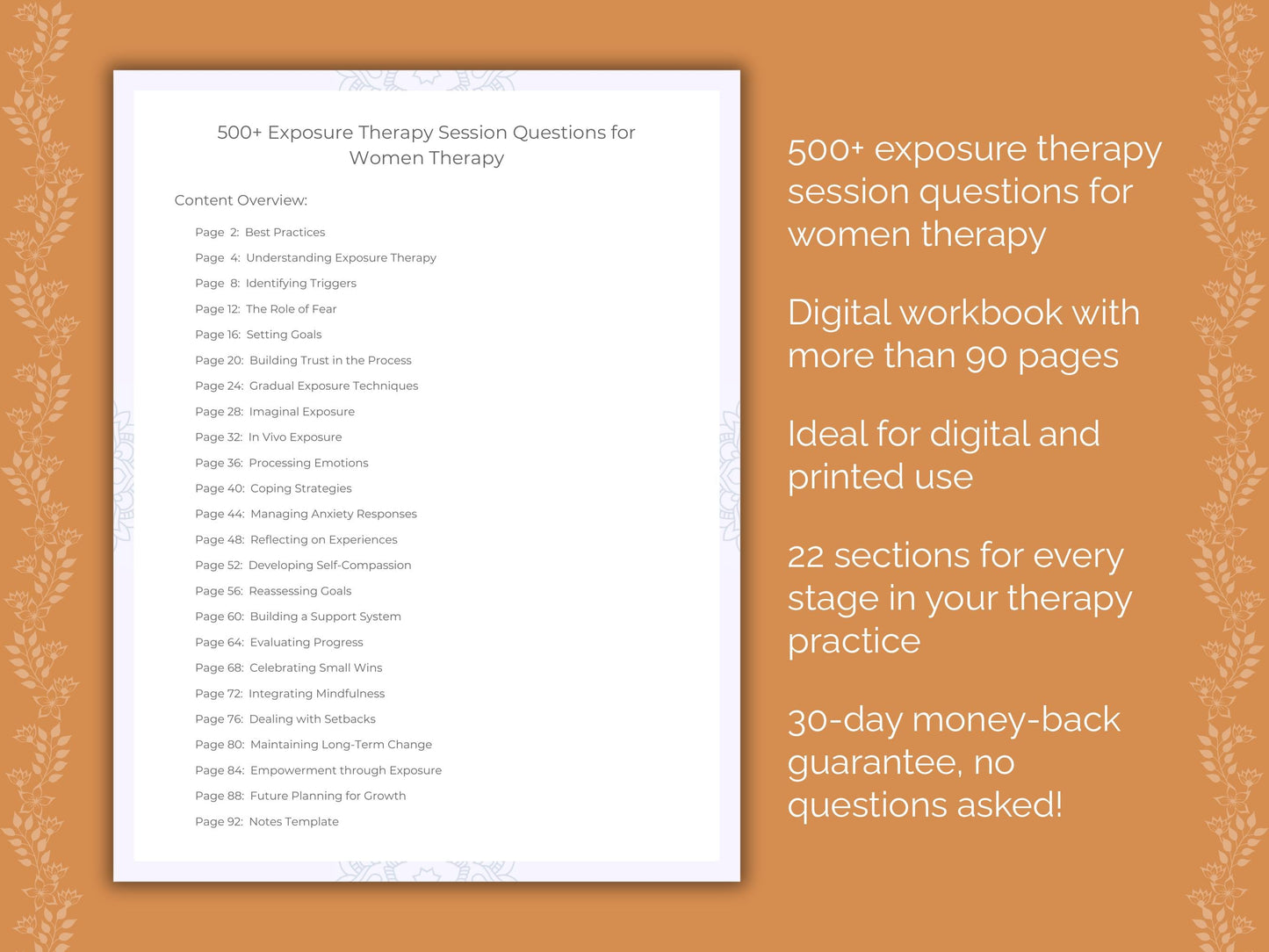 📚 Contains: One PDF workbook with over 500 exposure therapy session questions for women therapy in 22 sections, instantly downloadable in US letter and A4 size.