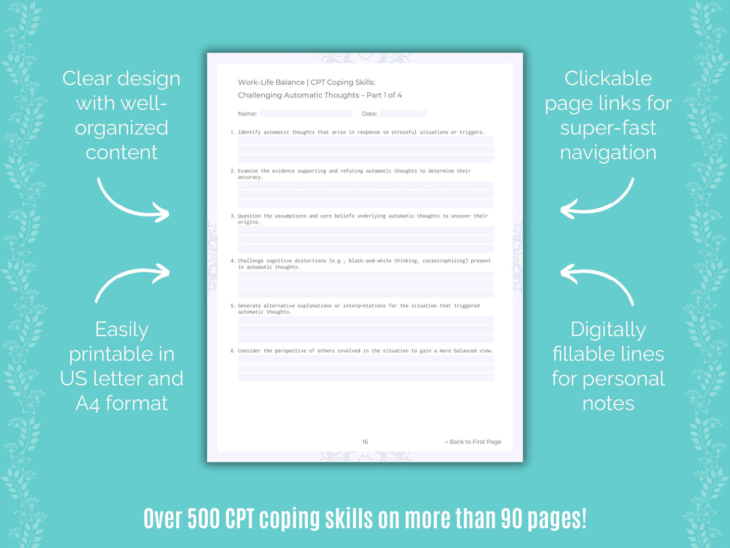 📚 Contains: One PDF workbook with over 500 cognitive processing therapy (CPT) coping skills for work-life balance therapy in 22 sections, instantly downloadable in US letter and A4 size.