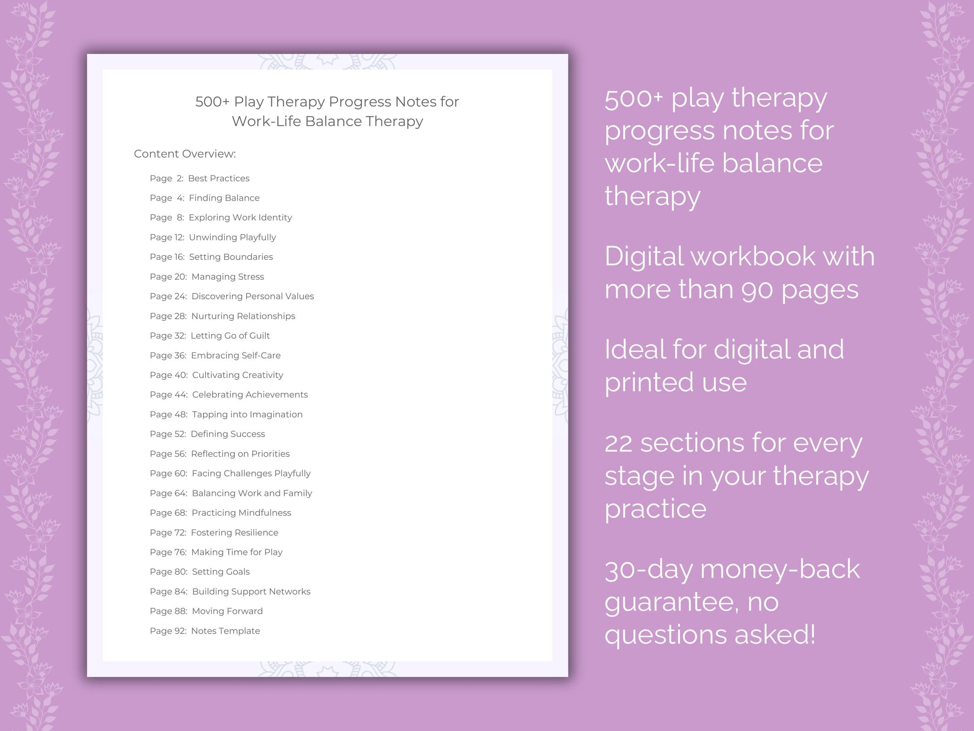 📚 Contains: One PDF workbook with over 500 play therapy progress notes for work-life balance therapy in 22 sections, instantly downloadable in US letter and A4 size.